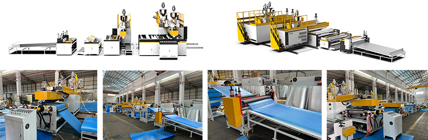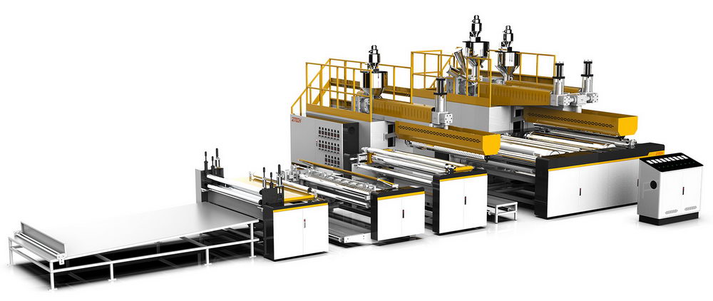 The production line consists of forming, compounding, stress elimination, trimming, and cutting parts, each part is equipped with an inverter for stepless speed adjustment, the whole production line can be adjusted synchronously. The production line possesses other features, such as easy for operation and maintenance, convenient for buying wearing parts, reliable product quality, and etc.