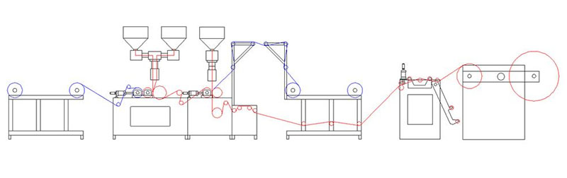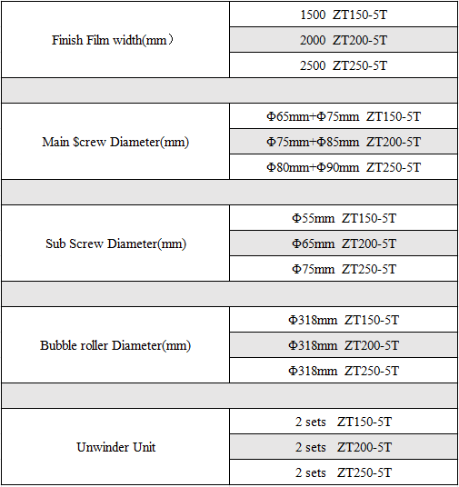 5 layer bubble film extruder is primarily comprised of a main extruder, a secondary extruder, a forming system, an aluminum composite film lamination rack, a winder and an electronic control system. Raw materials such as LDPE, LLDPE or recycled materials are firstly extruded by the main extruder at high temperature to produce bubble films. An additional PE film is then added by the secondary extruder. Composite materials such as aluminum foil, kraft paper, EPE foam can also be added. Compared to single screw extruder, twin screw extruder makes it possible to control thickness of bubble layer and base layer separately, thus having a better composite effect.