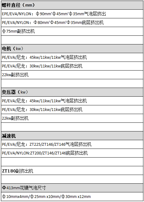 尼龙共挤气泡膜机由主挤出系统、成型系统、收卷系统和电控系统组成。主挤出系统通过6个单螺杆分别控制PE层、EVA层和尼龙层。每层可分别控制厚度和流量,确保更好的产品质量。
