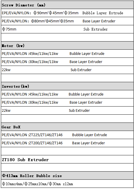 product quality.Nylon Co-extruded Bubble Film Machine shows higher toughness and durability irbubble generation compared to traditional models.Experimental data show that underthe same stress conditions, the gas loss rate of ordinary two-layer bubble film is ashigh as 50%, which is significantly reduced within 14 days. In contrast, the bubble filmwith Nylon Co-extrusion Technology, combined with glue and EVA material, has a gasloss rate of only 5%, showing excellent air retention performance.Equipped with 6screws, the machine is capable ofindependently controlling the production ofthe bottomlayer and the bubble layer with high flexibility.t is widely used in high-end furniture, autoparts and home appliance packaging, achieving the highest quality bubble film produc-tion with less packaging material and ensuring the safety of items during transport.