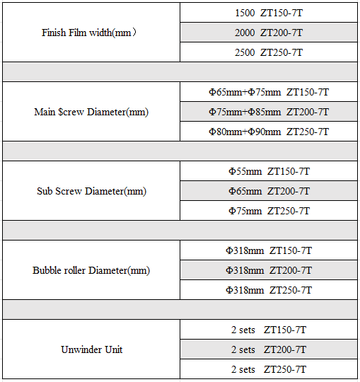 7 layer bubble film extruder is primarily comprised of a number 1 main extruder, a secondary extruder, a number 2 main extruder, a forming system, an aluminum composite film lamination rack, a winder and an electronic control system. Primarily, 2 sets of main extruders with twin screws and 1 set of secondary extruder with single screw produce 5 layer bubble films, in the meantime, composite materials such as aluminum foil, Kraft paper, and EPE foam can also be added. Compared to single screw extruder machines, twin screw extruder machines makes it possible to control the thickness of bubble layer and base layer separately thus having a better composite effect.